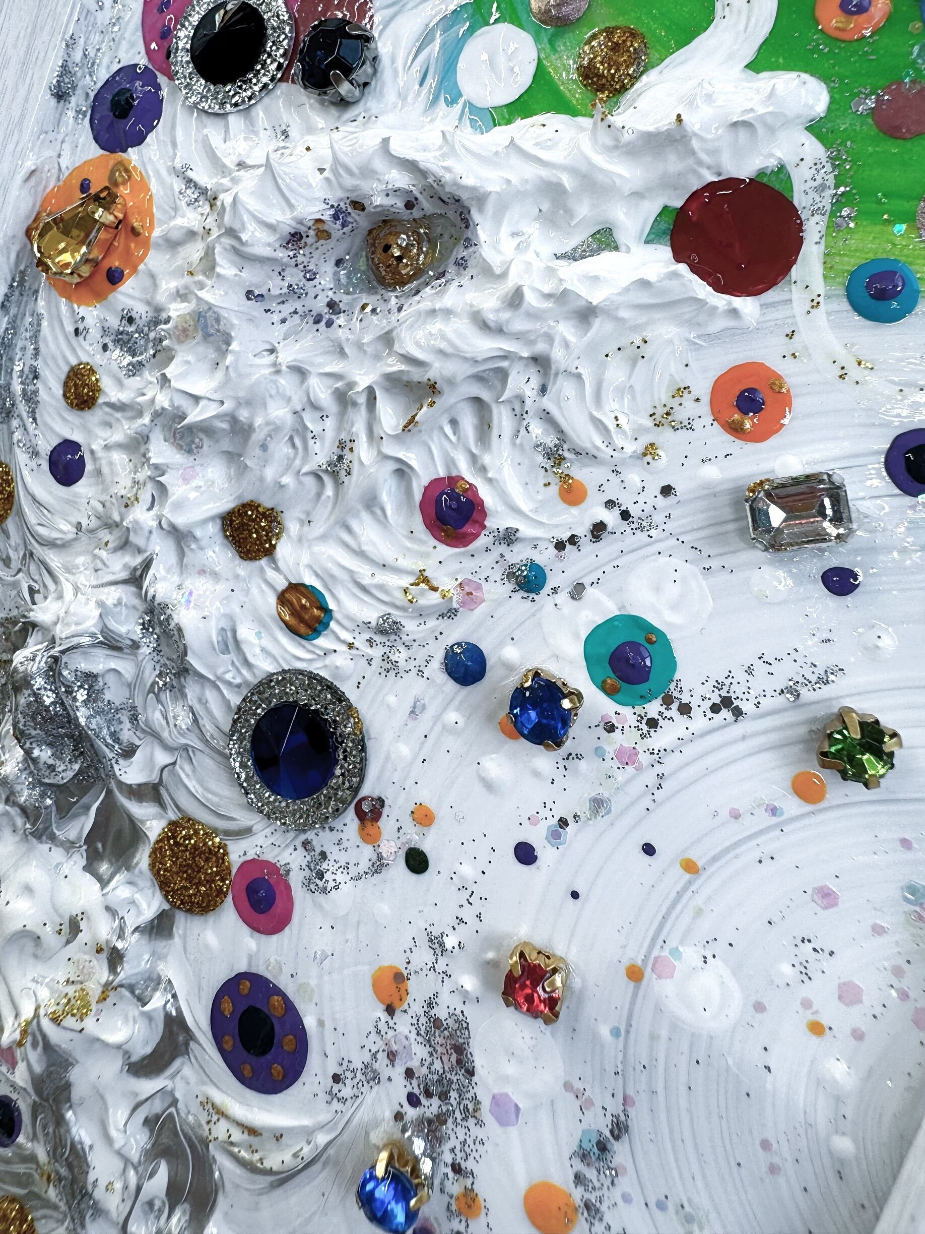 絵画はアクリル板に、アクリル絵の具で描いており、ストーンやラメも付いて宝石の様に光輝きます。表面を何層にもグロス加工してあり、とても艶々で耐久性に優れています。多少の水ではビクともしません。色の劣化も長期的にほとんどありません。小さなサイズなので、机や玄関など場所を選ばずどこにでもかざれます。