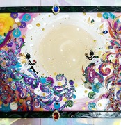 絵画はアクリル板に、アクリル絵の具で描いており、ストーンやラメも付いて宝石の様に光輝きます。表面を何層にもグロス加工してあり、とても艶々で耐久性に優れています。多少の水ではビクともしません。色の劣化も長期的にほとんどありません。小さなサイズなので、机や玄関など場所を選ばずどこにでもかざれます。